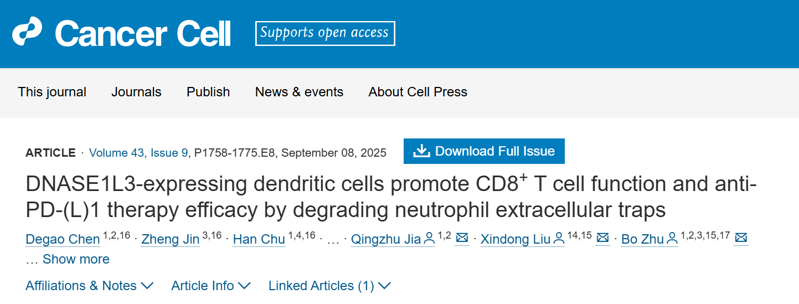 这项重要研究由陆军军医大学第二附属医院朱波团队与陆军军医大学第一附属医院刘新东团队联合完成,论文标题为《DNASE1L3-expressing dendritic cells promote CD8+T cell function and anti-PD-(L) 1 therapy efficacy by degrading neutrophil extracellular traps》。