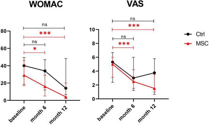 结果显示,hP-MSCs治疗不仅安全有效,还能显著降低患者的WOMAC和VAS评分,同时血清IL-2水平也明显下降,证实了干细胞显著的抗炎作用。