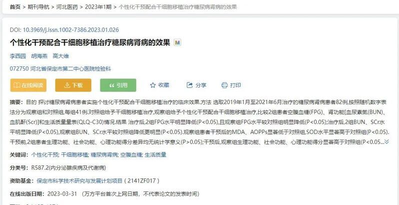 2023年,河北省保定市第二中心医院检验科在《河北医药》期刊发表一篇关于干细胞移植联合传统疗法治疗改善糖尿病肾病的文献。