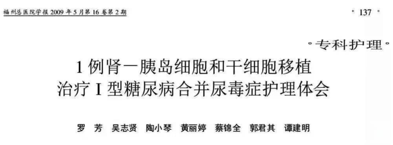 治疗后,患者肾功正常,生命体征正常,血糖控制平稳,胰岛素用量减少了近40单位/天。空腹和餐后C肽水平较移植前有明显的提高。出院后患者顺利走上工作岗位,实现了从毫无劳动能力的重症患者到能创造社会价值的劳动者的转换。