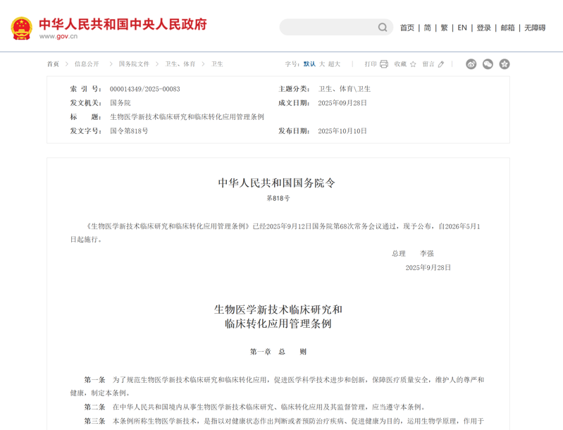 近日,国务院总理李强签署了第 818 号国务院令,公布了《生物医学新技术临床研究和临床转化应用管理条例》(以下简称《条例》),该条例自 2026 年 5 月 1 日起施行。