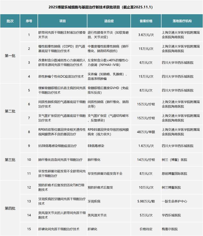 11月1日,博鳌乐城细胞年会2025年度盛典再传捷报——第四批4个细胞治疗项目正式落地,价格与医院信息同步公开。
