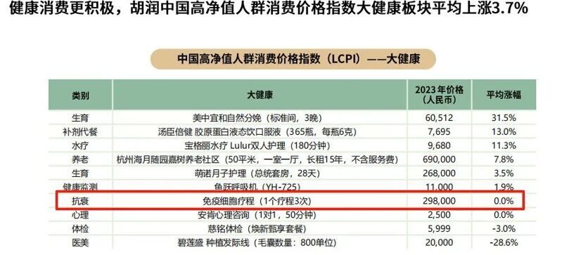 2024年的市场数据最有说服力:大健康板块平均涨幅3.7%,远超奢侈品2%的跌幅;免疫细胞疗程价格稳定在29.8万元,其抗衰项目价格更是从2021年的20万跃升至2023年的30万,涨幅达50%,需求却依然旺盛。