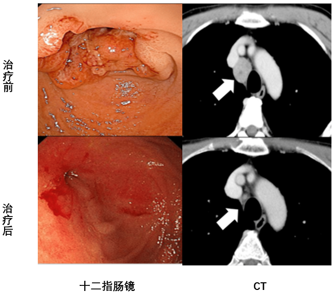 患者为72岁男性,确诊为原发性十二指肠腺癌(IV期,T3N2M1),伴左锁骨上及纵隔淋巴结转移。在完成胃空肠旁路手术后,接受了以S-1联合奥沙利铂(SOX)为方案的一线化疗,初期疗效显著,原发灶及淋巴结转移灶均有明显缩小。