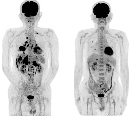 左侧(治疗前):诊断时的PET-CT显示除右下肺原发肿瘤外,还显示多发性双侧肺内转移、多发性肝转移、双侧肾上腺转移和多发性骨转移。