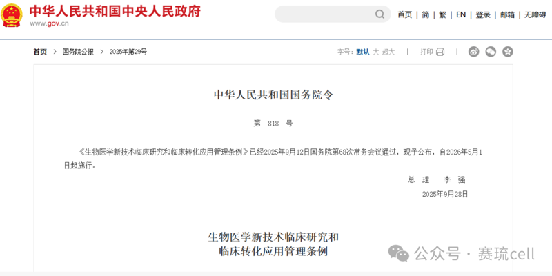 随着《生物医学新技术临床研究和临床转化应用管理条例》(国务院第818号令)的即将施行(2026年5月1日),药品监管与医疗技术管理的“双轨制”将在全国层面正式落地施行,为细胞治疗临床转化划定了清晰的合规路径。